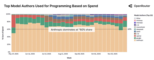 درحالیکه نقشآفرینی بر استفاده از مدلهای متنباز تسلط دارد، برنامهنویسی سریعترین رشد را در بین تمام دستهبندیهای مدلهای هوش مصنوعی داشته است. در ابتدای سال ۲۰۲۵، درخواستهای مرتبط با کدنویسی تنها ۱۱ درصد از کل استفاده هوش مصنوعی را تشکیل میدادند. تا پایان سال، این رقم به بیش از ۵۰ درصد افزایش یافت.